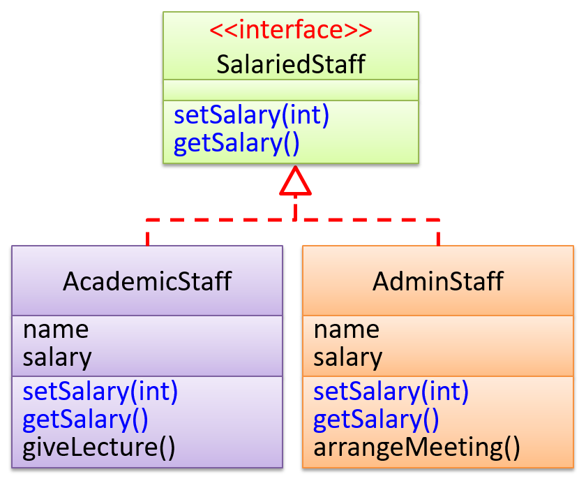 The Payroll class should not depend on the AdminStaff class because it does not use the arrangeMeeting() method. Instead, it should