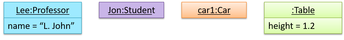 | Object | Real World? | Virtual World? | Example of State (i.e. Data) | Examples of Behavior (i.e. Operations) |