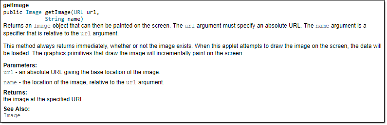 /** * Returns an Image object that can then be painted on the screen. * The url argument must specify an absolute {@link URL}. The name * argument is a specifier that is relative to the url argument. * <p> * This method always returns immediately, whether or not the * image exists. When this applet attempts to draw the image on * the screen, the data will be loaded. The graphics primitives * that draw the image will incrementally paint on the screen. * * @param url an absolute URL giving the base location of the image * @param name the location of the image, relative to the url argument * @return the image at the specified URL * @see Image */ public Image getImage(URL url, String name) { try { return getImage(new URL(url, name)); } catch (MalformedURLException e) { return null; } }