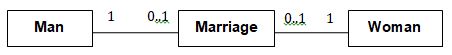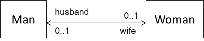 public class Marriage { private Man husband = null; private Woman wife = null; // extra information like date etc can be added public Marriage(Man m, Woman w) throws Exception { if (m == null || w == null) { throw new Exception("no man/woman"); } if (m.isMarried() || w.isMarried()) { throw new Exception("already married"); } husband = m; m.enterMarriage(this); wife = w; w.enterMarriage(this); } public Man getHusband() throws Exception { if(husband == null) { throw new Exception("error state"); } else { return husband; } } public Woman getWife() throws Exception { if(wife == null) { throw new Exception("error state"); } else { return wife; } } // removal of both ends of 'Marriage' public void divorce() throws Exception { if (husband==null || wife==null) { throw new Exception("no marriage"); } husband.removeFromMarriage(this); husband = null; wife.removeFromMarriage(this); wife = null; }}