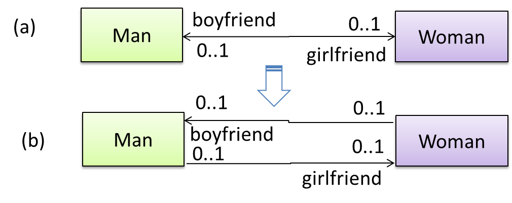 A bidirectional association in the design (shown in (a)) is usually emulated at code level using two variables (as shown in (b)).