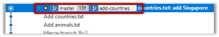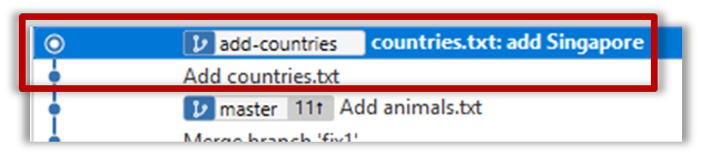 10. Create a new branch called add-countries, switch to it, and add some commits to it (similar to steps 1-2 above). You should have something like this now:
