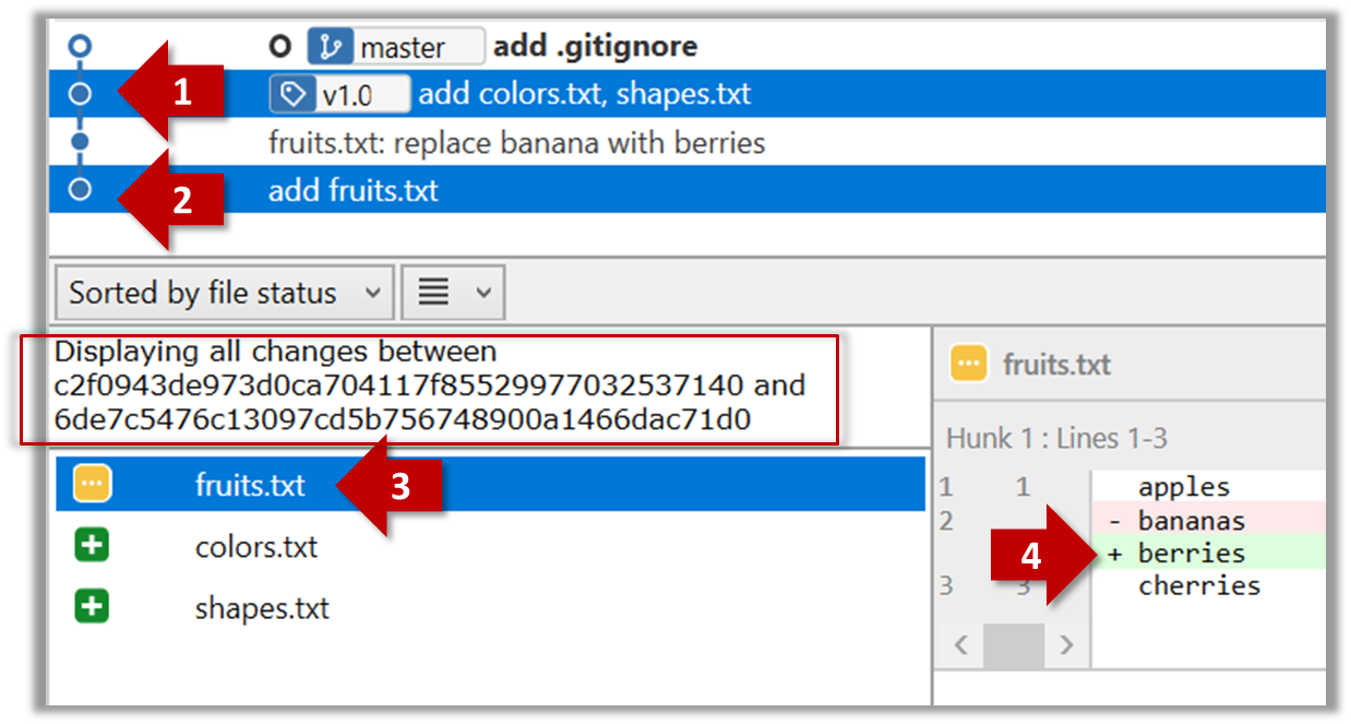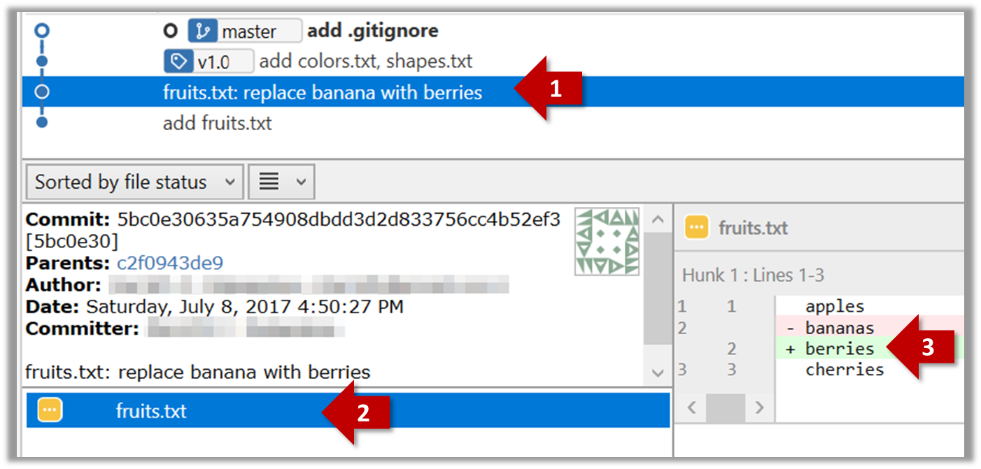 commit 5bc0e30635a754908dbdd3d2d833756cc4b52ef3Author: … < … >Date: Sat Jul 8 16:50:27 2017 +0800 fruits.txt: replace banana with berriesdiff --git a/fruits.txt b/fruits.txtindex 15b57f7..17f4528 100644--- a/fruits.txt+++ b/fruits.txt@@ -1,3 +1,3 @@ apples-bananas+berries cherries