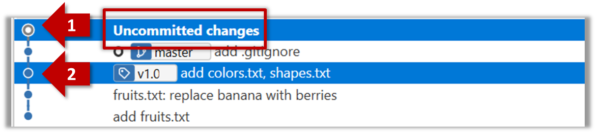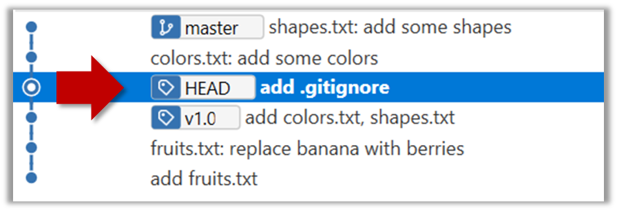 The specified version is now loaded to the working folder, as indicated by the HEAD label. HEAD is a reference to the currently checked out commit.