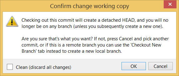 Click OK to the warning about ‘detached HEAD’ (similar to below).