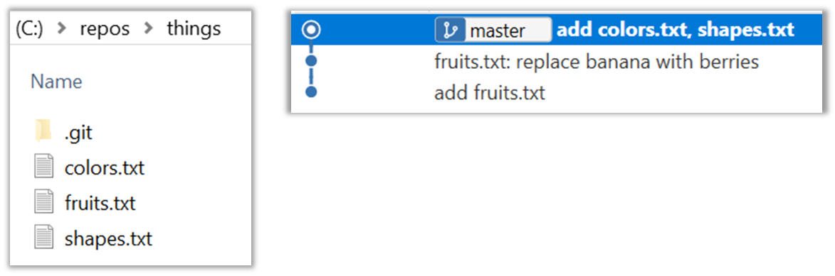 Next, add two more files colors.txt and shapes.txt to the same working directory. Add a third commit to record the current state of the working directory.