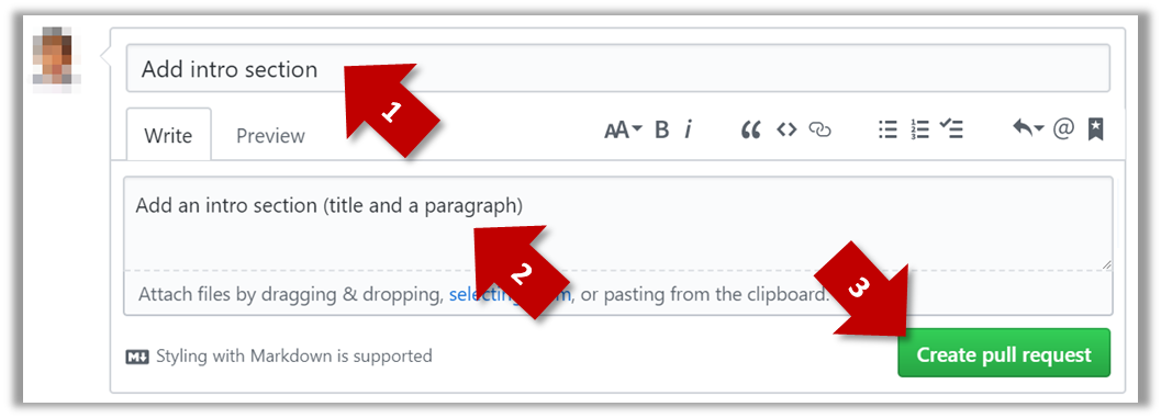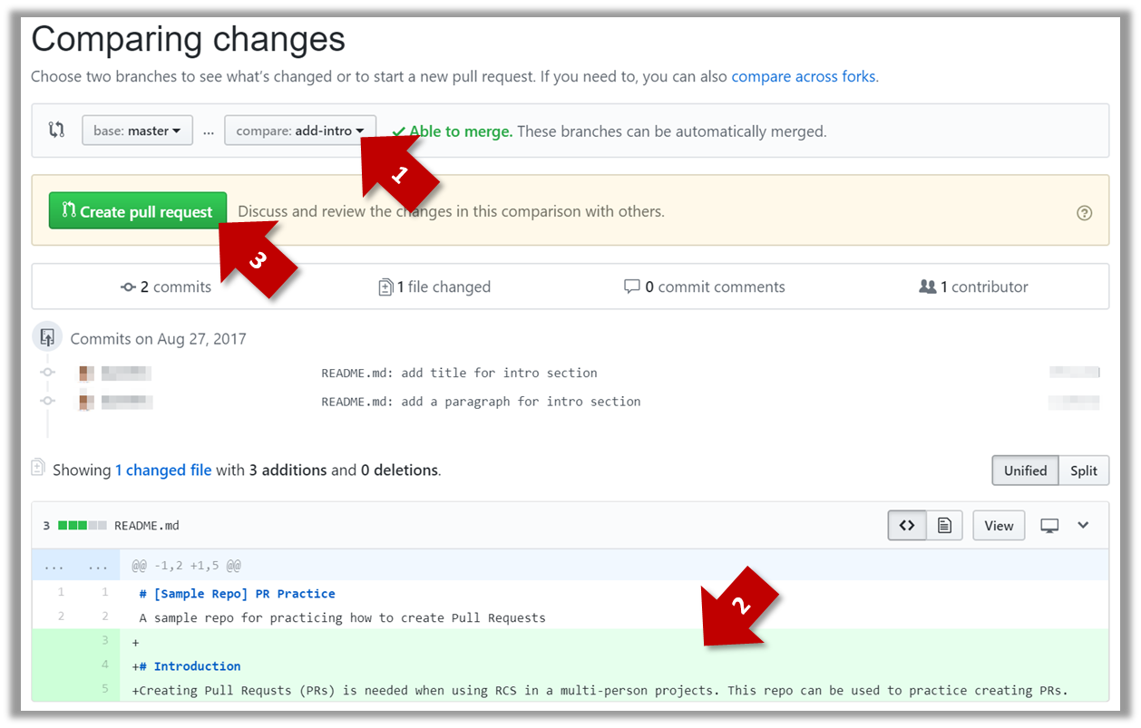 and (3) click the Create pull request button.