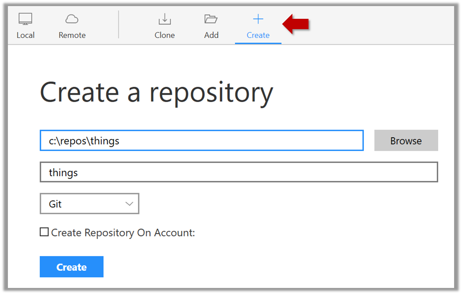 Enter the location of the directory (Windows version shown below) and click Create.