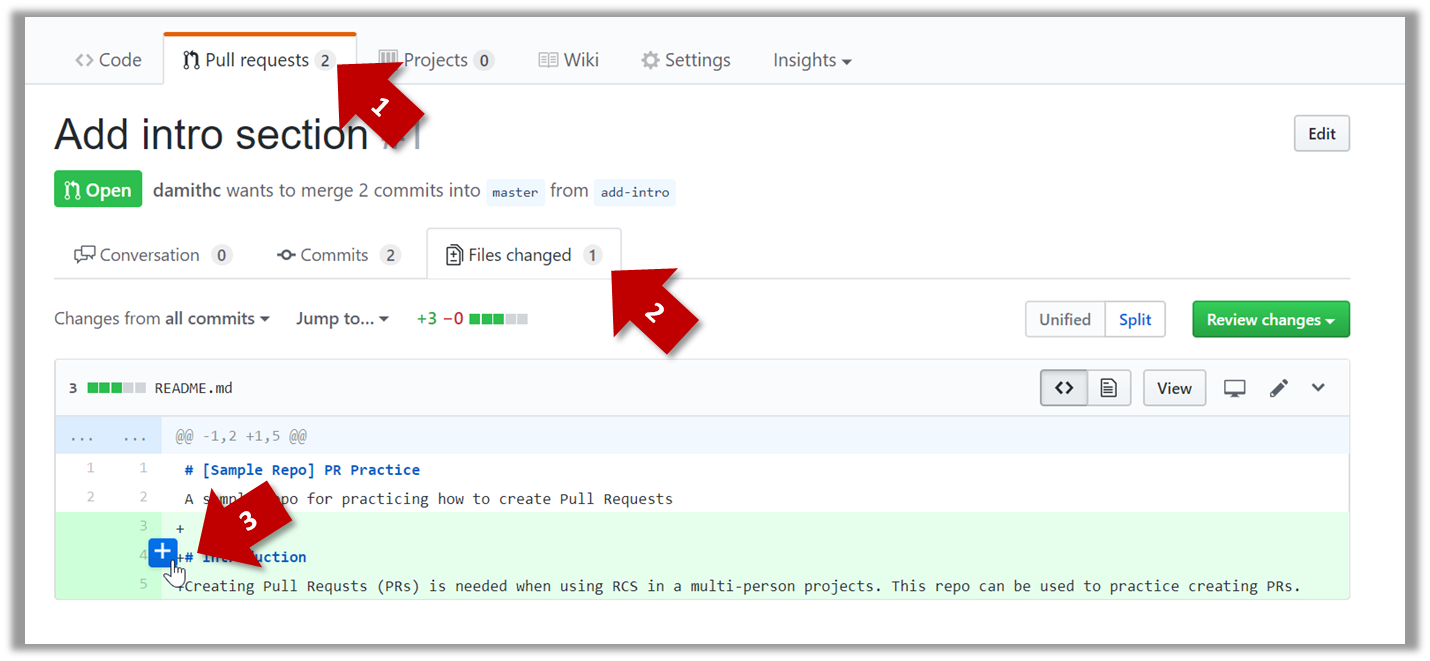 1. Go to the GitHub page of your fork and review the add-intro PR you created previously in [
