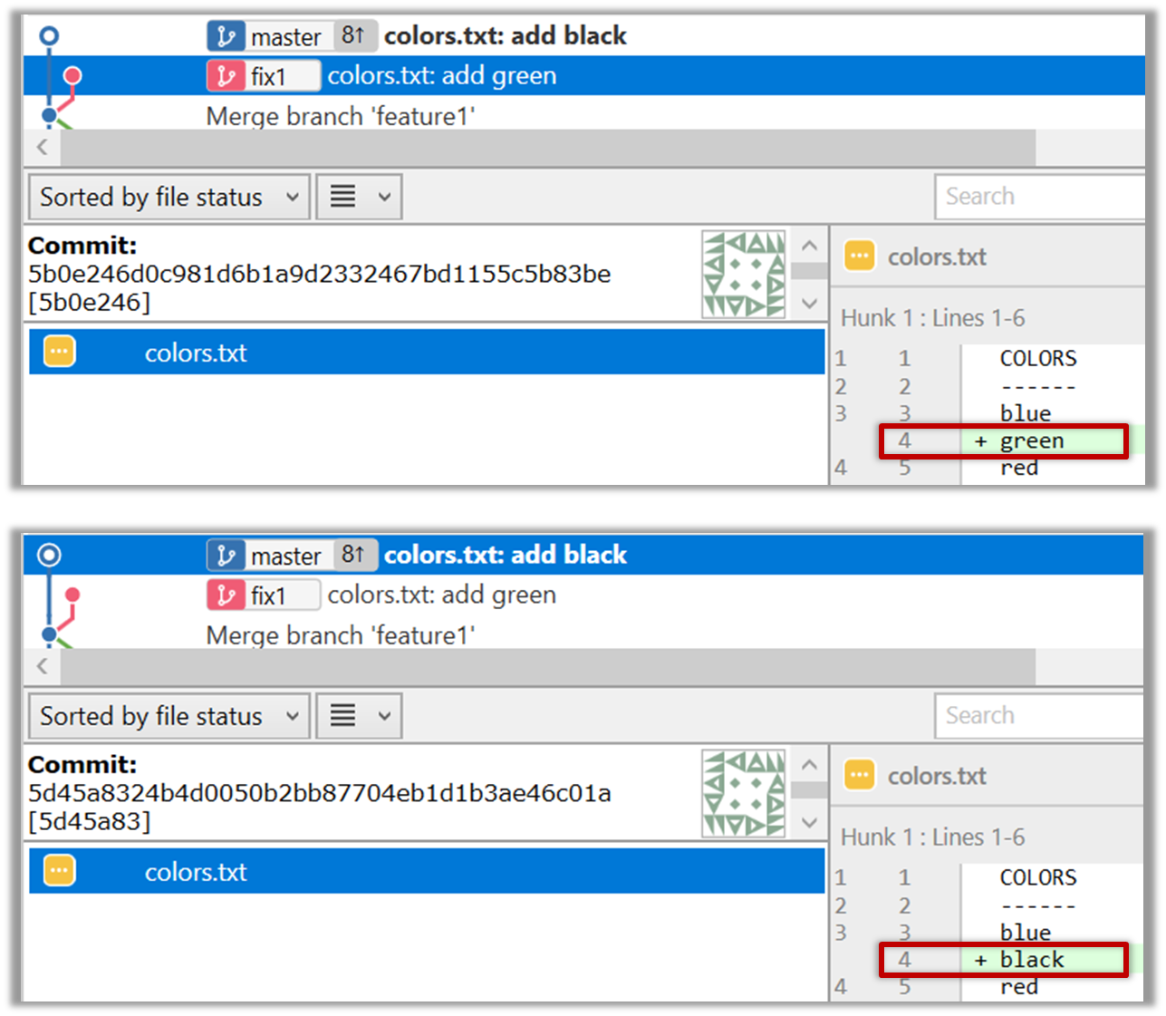 5. Resolve the conflict by editing the file. Let us assume you want to keep both lines in the merged version. You can modify the file to be like this: