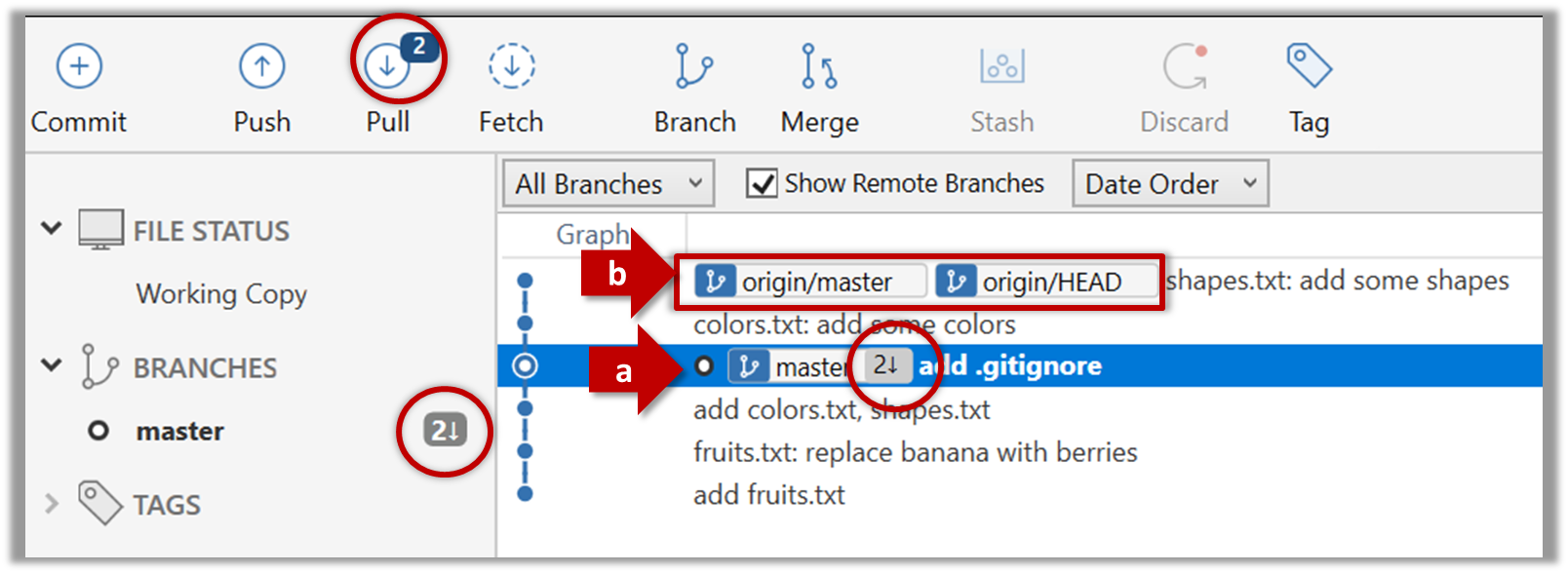 Click the Commit button, enter a commit message e.g. add fruits.txt in to the text box, and click Commit
