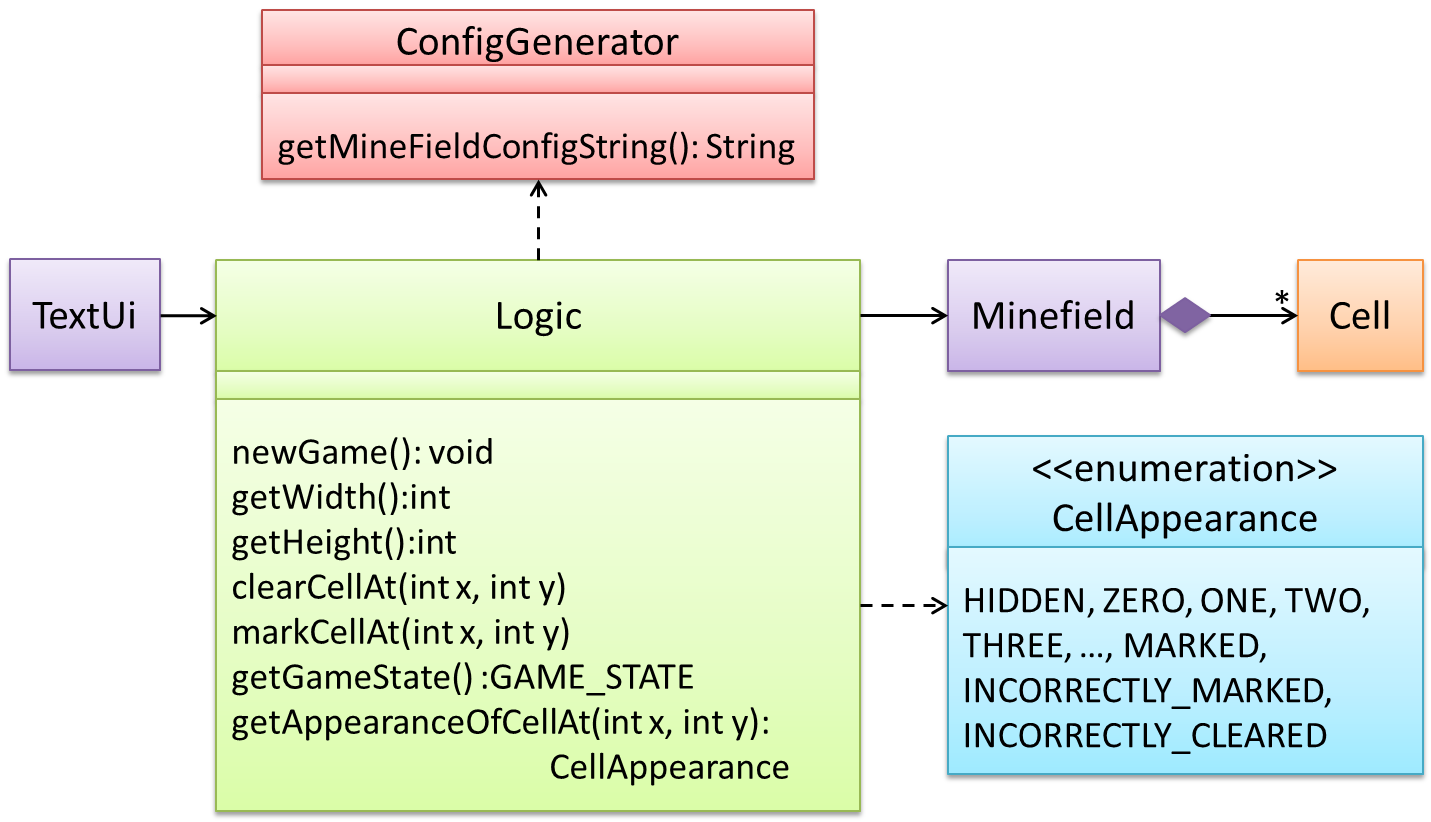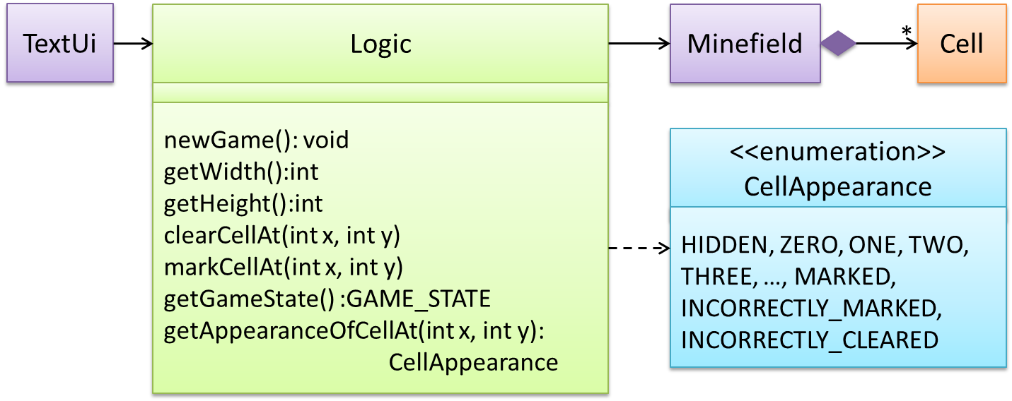 In the above design, TextUi does not access Cell objects directly. Instead, it gets values of type CELL_APPEARANCE from Logic to be displayed as a minefield to the player. Alternatively, each cell