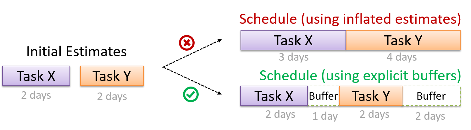 A buffer is a time set aside to absorb any unforeseen delays. It is very important to include buffers in a software project schedule because effort/time estimations for software development is notoriously hard. However, do not inflate task estimates to create hidden buffers; have explicit buffers instead. Reason: With explicit buffers it is easier to detect incorrect effort estimates which can serve as a feedback to improve future effort estimates.