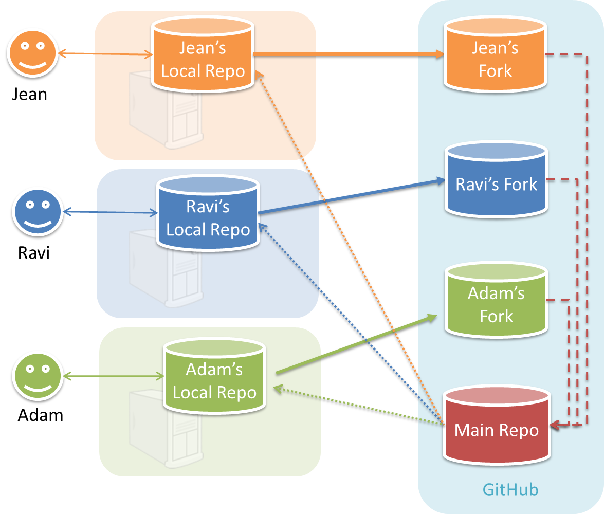 - Other members, realizing there is new code in the upstream repo, sync their forks with the new upstream repo (i.e. the main repo). This is done by pulling the new code to their own local repo and pushing the updated code to their own fork.