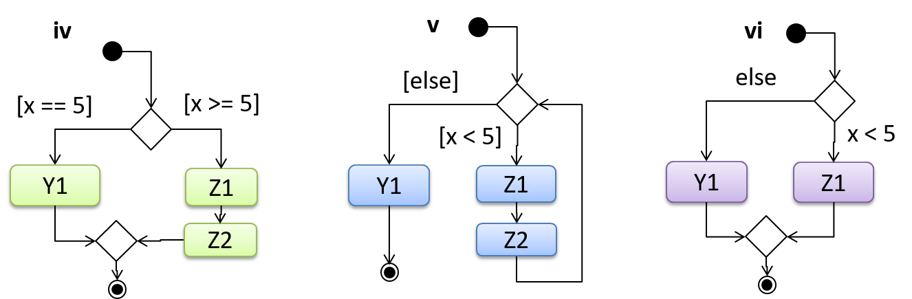 x=5both guard conditions become true. - v : 👍 Correct. It is fine for a branch to form a loop by going back to the original branch node.